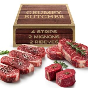 Grumpy Butcher 8 Steaks Premium Set – 4 NY Strips (10 oz), 2 Ribeye Steaks (14 oz), 2 Large Filet Mignons (8 oz) – Steakhouse Quality Meat Gourmet Gift Basket